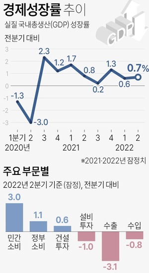 한국 경제 성장률이 상반기 3% 가깝게 올랐다. 하지만 하반기 고물가와 세계적인 경기 침체 가능성 등의 영향으로 올해 2%대 중반에 그칠 것이라는 전망이다.◇ 올해 남은 2.5% 이상 성장 가능성31일 한국은행 등에 따르면 지난 상반기 실질 국내총생산은 지난해 같은 기간보다 2.9% 늘었다. 1·2분기 실질 GDP가 전기보다 각각 0.6%, 0.7% 성장했다. 정부는 올해 경제성장률이 2%대 중반을 기록할 가능성이 높다고 보고 있다. 3·4분기에 역성장하지 않도록 소비와 수출 증가세가 유지돼야 가능한 수치다.지난...